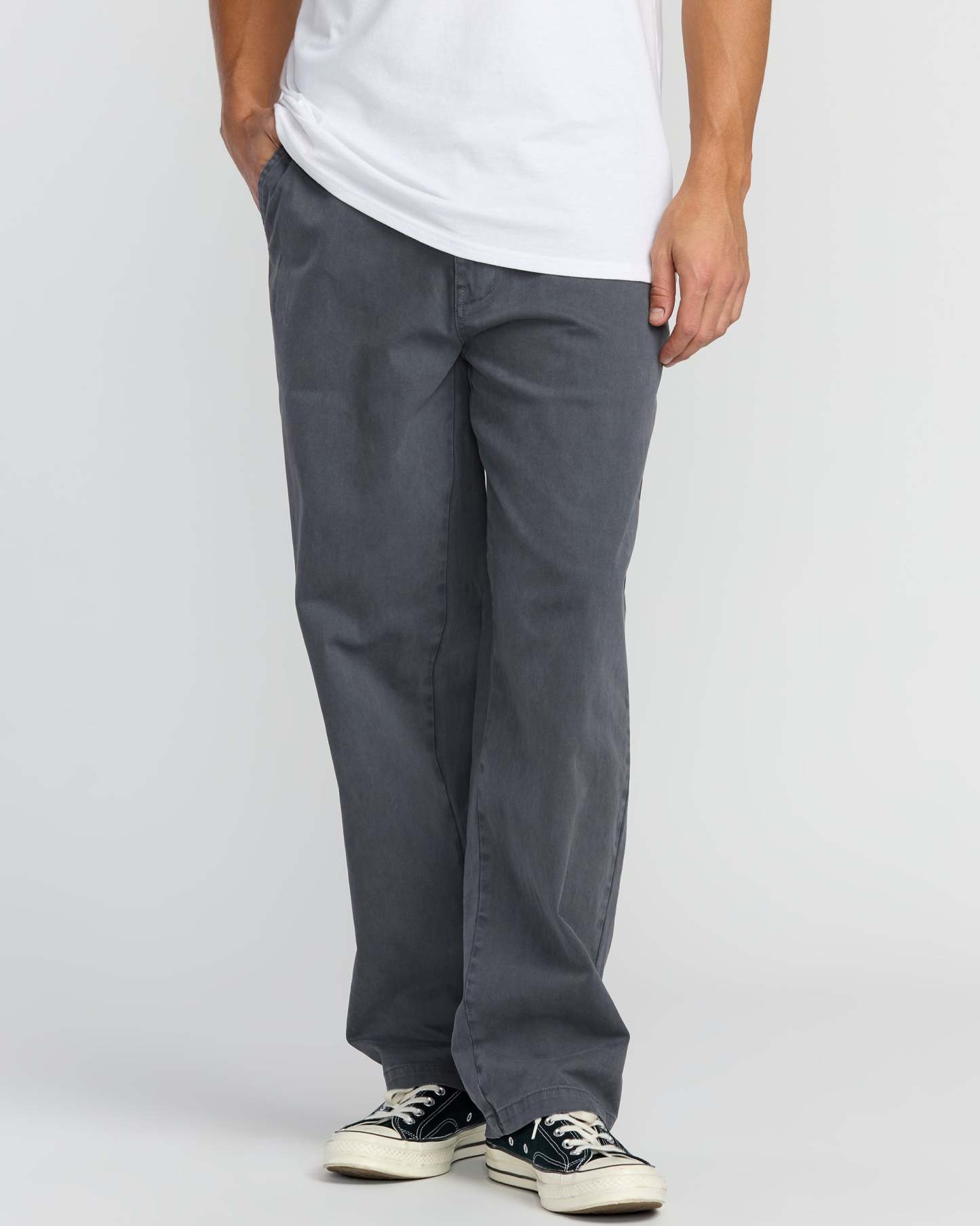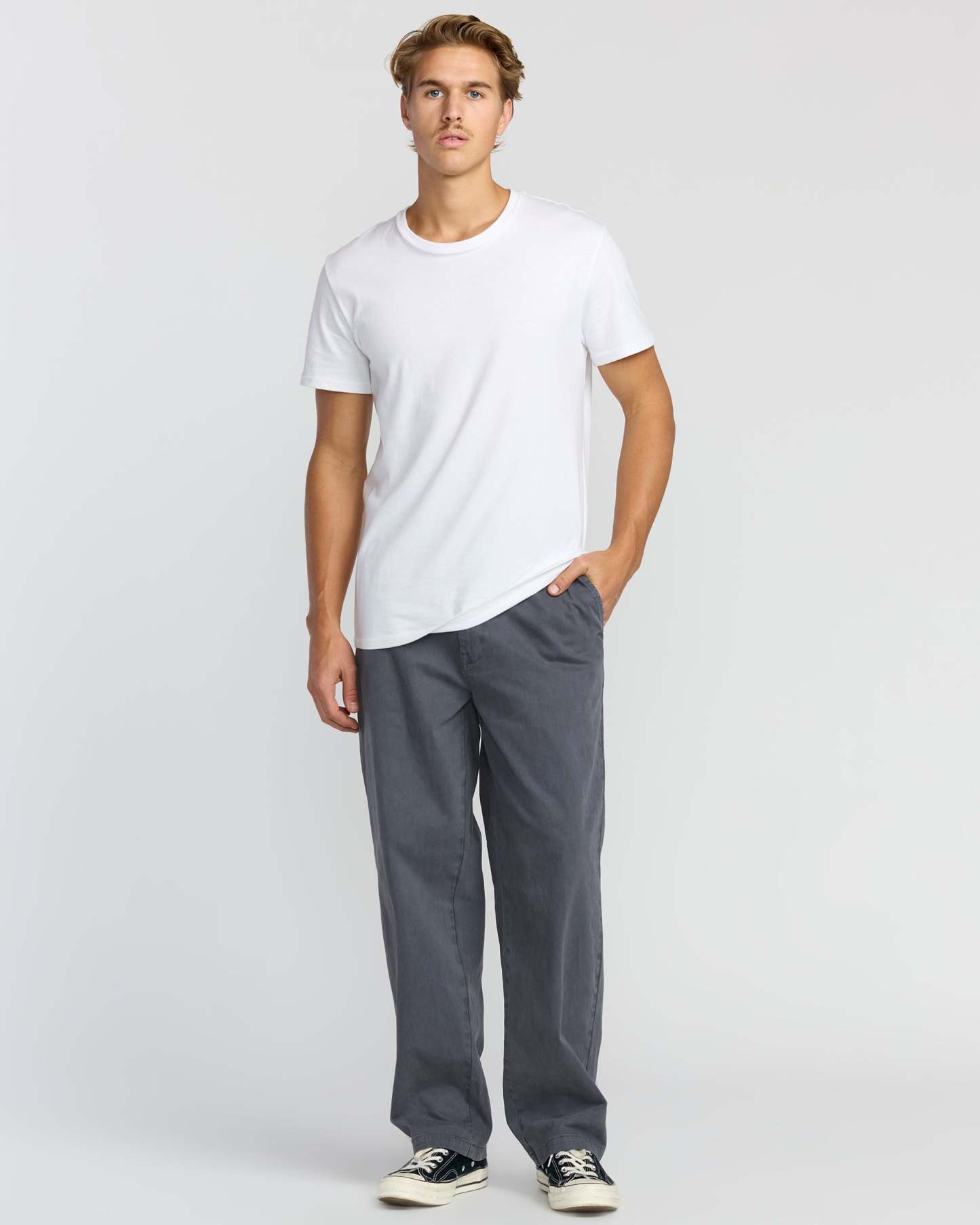 Our vintage-washed chinos blend structured workwear style with everyday comfort. The peached cotton twill fabric feels soft against skin, while practical pockets and a slim straight fit keep things clean and classic. Featured here in the Blue colorway.