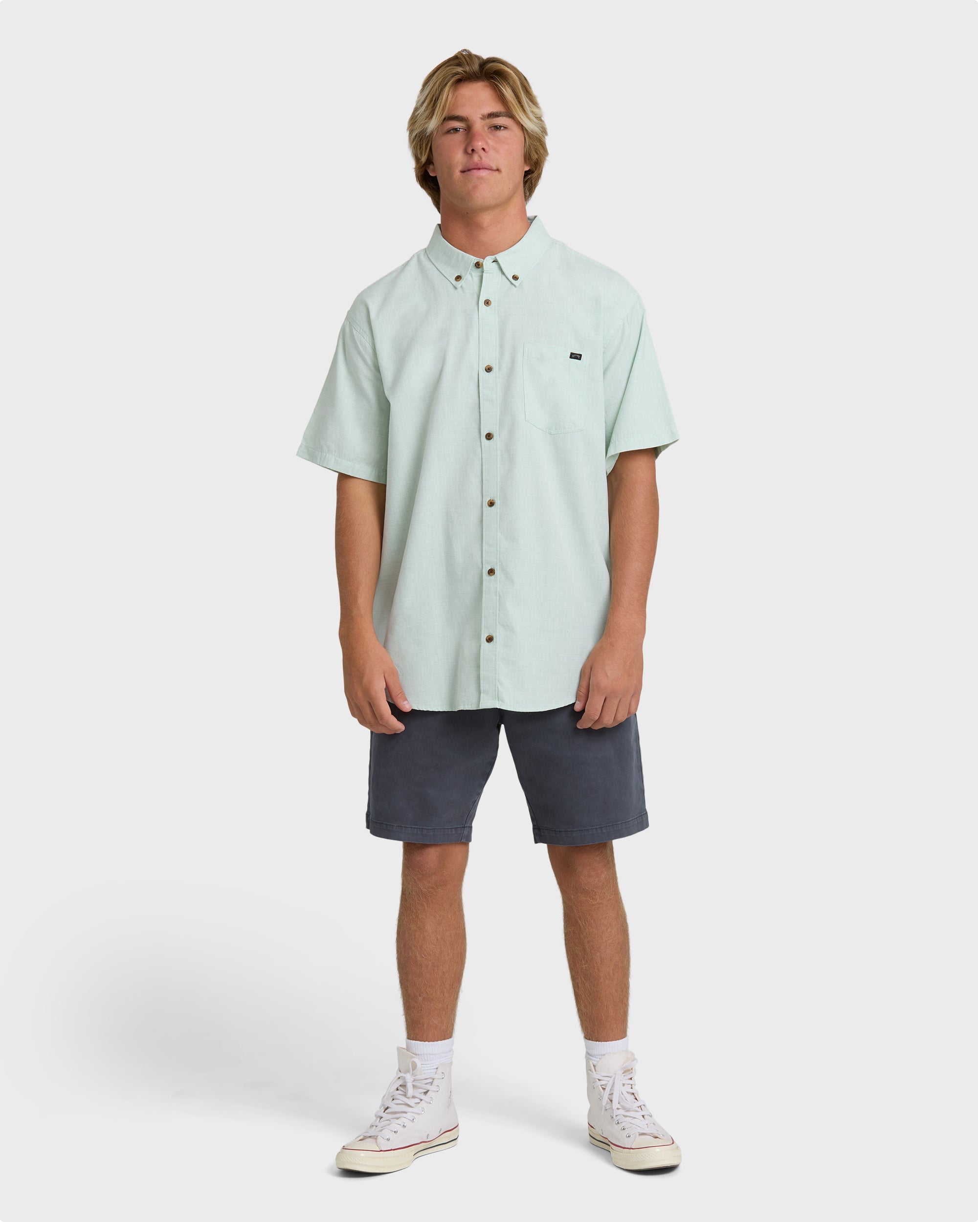 Stay ready for whatever the day brings with our All Day Short Sleeve Shirt in Granite Green. This regular fit short sleeve shirt adds style with its front buttons and practical chest pocket, while the soft cotton-poly blend ensures comfort and shape. Subtle woven labels tops it off as a warm-weather essential.