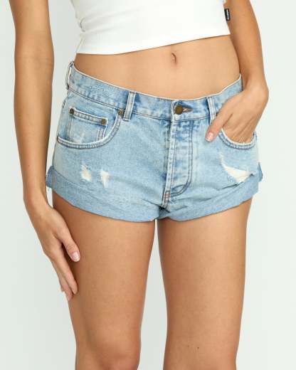 Stay cool all summer in these 100% cotton denim shorts. A low rise, 1.5" inseam keeps you breezy, while rolled cuffs and 5 pockets nail that easygoing, weekend-ready vibe. Branded with a Billabong logo flag label. Featured here in the Light Wash Destroy colorway.