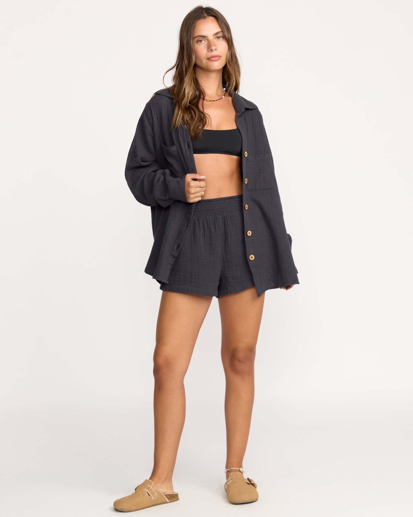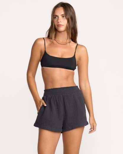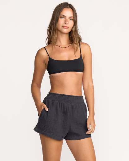 Effortless breezy style. These 100% cotton double gauze shorts keep you cool with lightweight breathable fabric. Elastic smocked waistband and relaxed regular fit provide casual all-day comfort. Side pockets stash small essentials. Featured here in the Black Sands colorway.