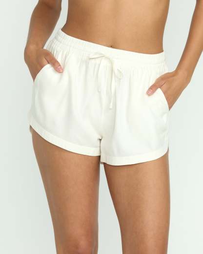 Relaxed cotton/viscose twill shorts with elastic waist and drawcord. Regular fit with side pockets. Breathable and soft for casual days, travel or beach. Featured here in the Salt Crystal colorway.