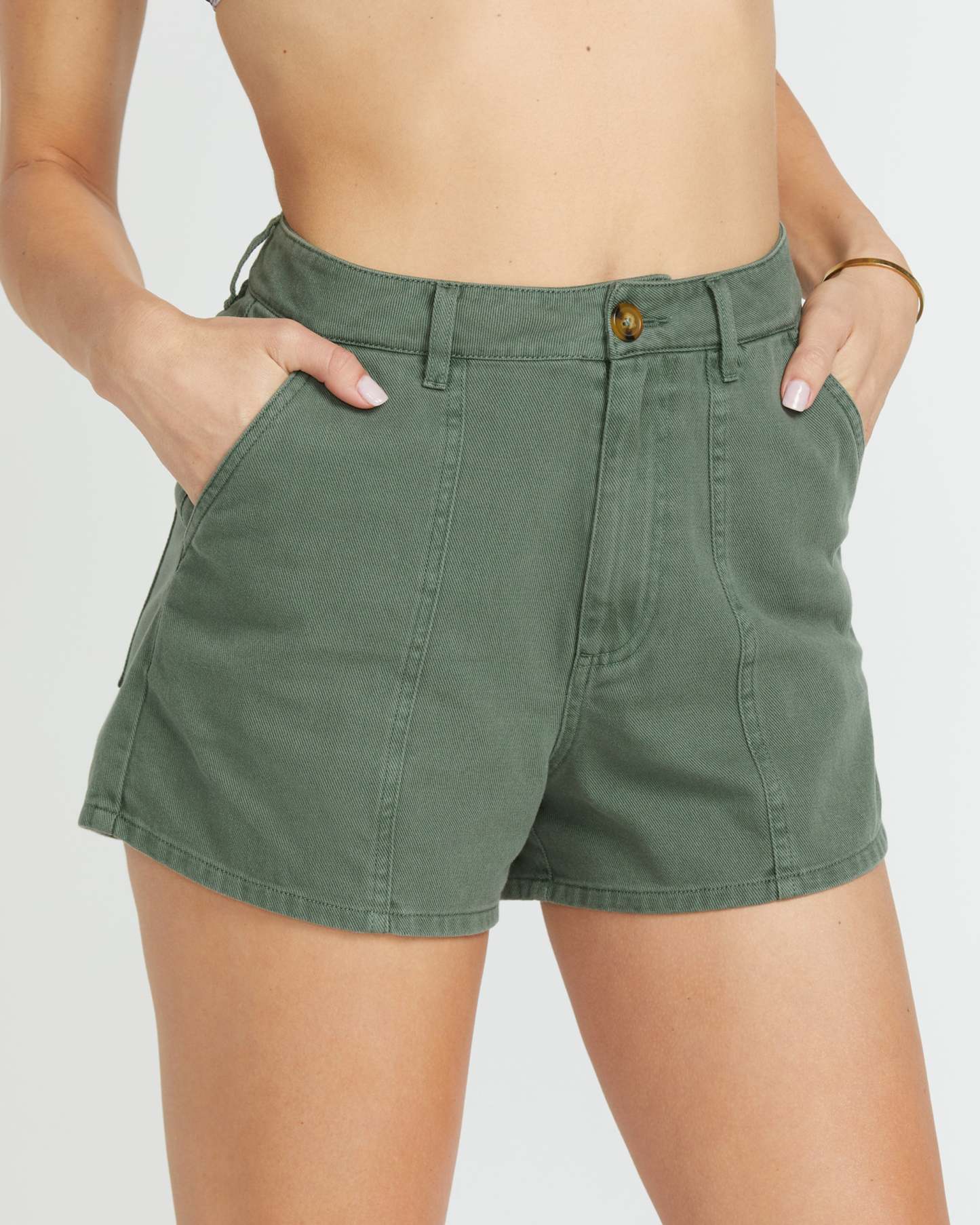 Crafted from 100% cotton twill, these high-waisted denim shorts offer a slim, flattering fit. Zipper fly and multiple pockets provide functional style. Perfect for summer fun. Featured here in the Forest colorway.