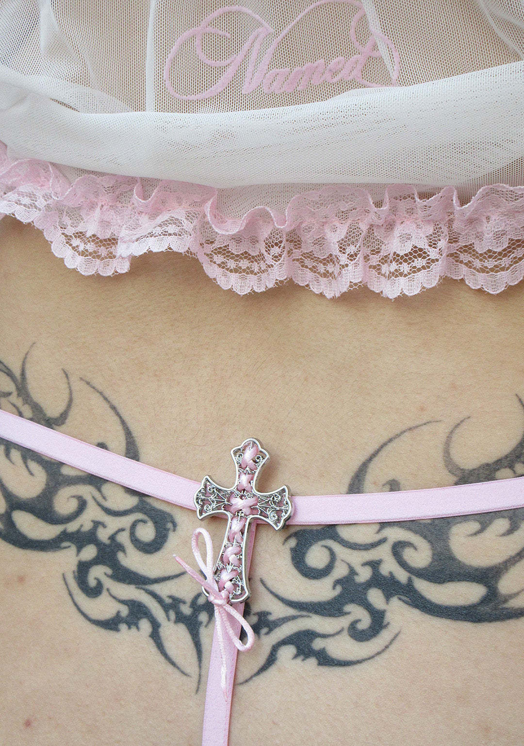 ★ Custom WHISPER cross charm with laced-in baby pink ribbon