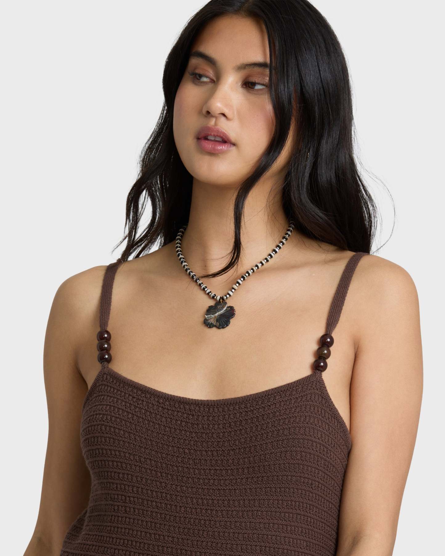 - Fit: Straight neckline with wood bead detail at straps